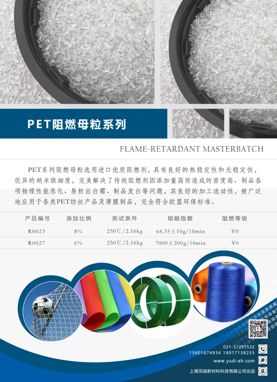 羽迪PET阻燃母粒,选用进口优质阻燃剂,具有良好的热稳定性和光稳定性,优异的纳米级细度,完美解决了传统阻燃剂添加量高而造成的密度高、制品各项物理性能恶化、易析出白霜、制品发白等问题,其良好的加工流动性,被广泛应用于各类PET纺丝产品,完全符合欧盟环保标准。