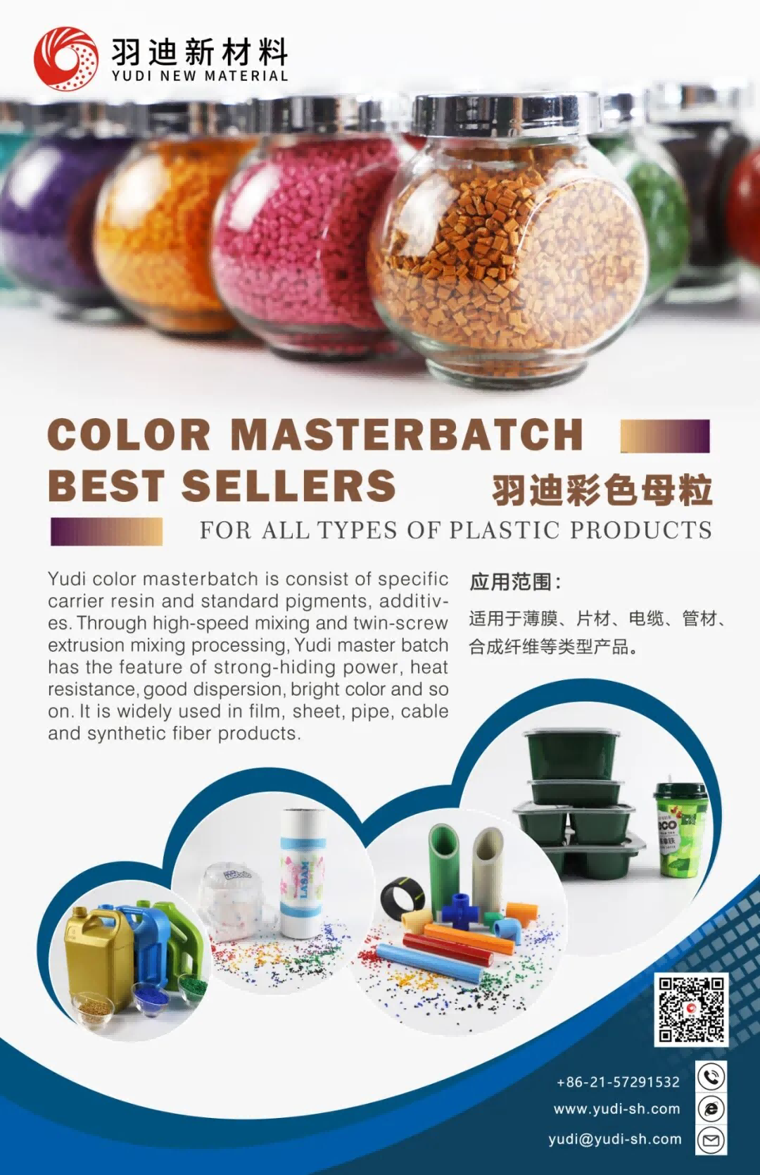 羽迪彩色母粒系列是以特定载体树脂配合符合标准的颜料、助剂等,经高速混合,双螺杆挤出混炼加工而成,具有遮盖力强、耐热、分散性好、色泽鲜艳等特点,广泛应用于薄膜、片材、管材、电缆和合成纤维产品中。